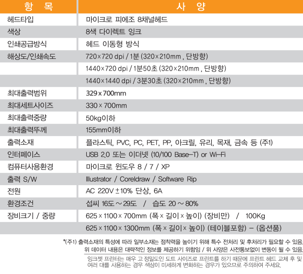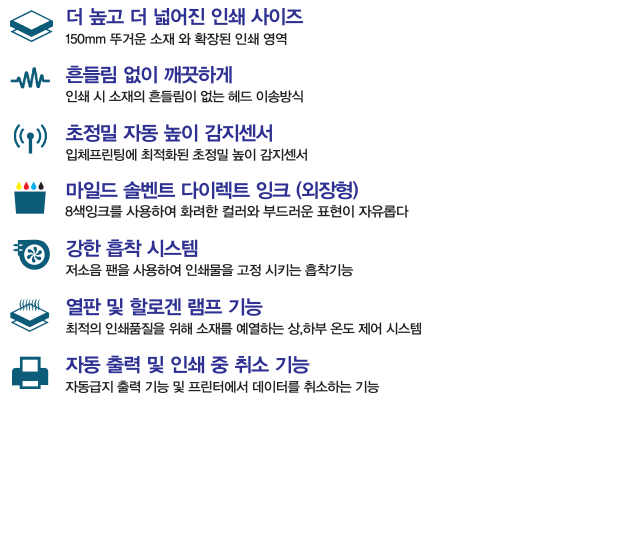 더 높고 더 넓어진 인쇄 사이즈, 흔들림 없이 깨끗한 이송방식, 초정밀 자동 높이 감지센서, 마일드 솔벤트 다이렉트 잉크(외장형), 강한 흡착 시스템, 열판 및 할로겐 램프 기능, 자동 출력 및 인쇄 중 취소 기능