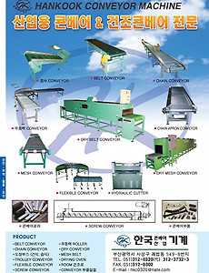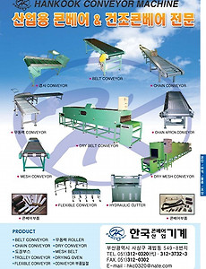 한국기계(콘베어 산업) 주소: 부산광역시 사상구 괘법동 549-8번지 전화: 051-312-0320, 312-3738~3 주요취급: 산업용 콘베어, 건조 콘베어, BELT CONVEYOR, 벨트 콘베어, CHAIN CONVEYOR, 체인콘베어, 건식도장부스, 습식도장부스, TROLLEY CONVEYOR, FLEXOBLE CONVEYOR, SCREW CONVEYOR, 무동력 ROLLER, DRY CONVEYOR, MESG BELT, DRYING OVEN, ROOM 건조로, CONVEYOR 부품
